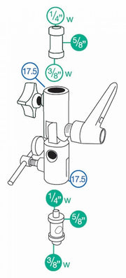 Great innovative touches also include the lack of a ball joint; which enables this adapter to stay completely locked down, even when you're working fast. You can slot it in and release using a large, easy to grasp handle. So no fiddling around required! And it comes complete with everything you need to get going, including two industry standard, removable 5/8” studs (1x) 5/8” with male 3/8” and 1/4” thread and (1x) 5/8” stud female 3/8” and 1/4” threads.