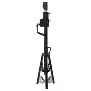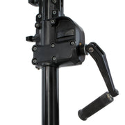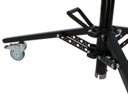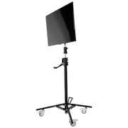 A strong, lightweight crank stand with low profile legs for clearance of long, wide, or low hanging panel lights, balloon lights, large monitors, LED screens, overhead frames, and backdrops. The stand comes equipped with a balanced & built-in carry handle for transport and will fold up tight for storage. The main column can be adjusted and lowered at the leg base. The low rolling base makes it possible to roll underneath furniture, vehicles, and many other set ups with low clearance.